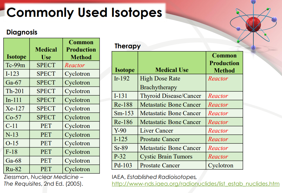While Cyclotrons (such as Iran’s Pars or Karaj cyclotrons) can generate some isotopes used in medicine (needed for PET and MRI diagnostics), many can only be created through reactors that use highly enriched uranium as outlined in the graph above.