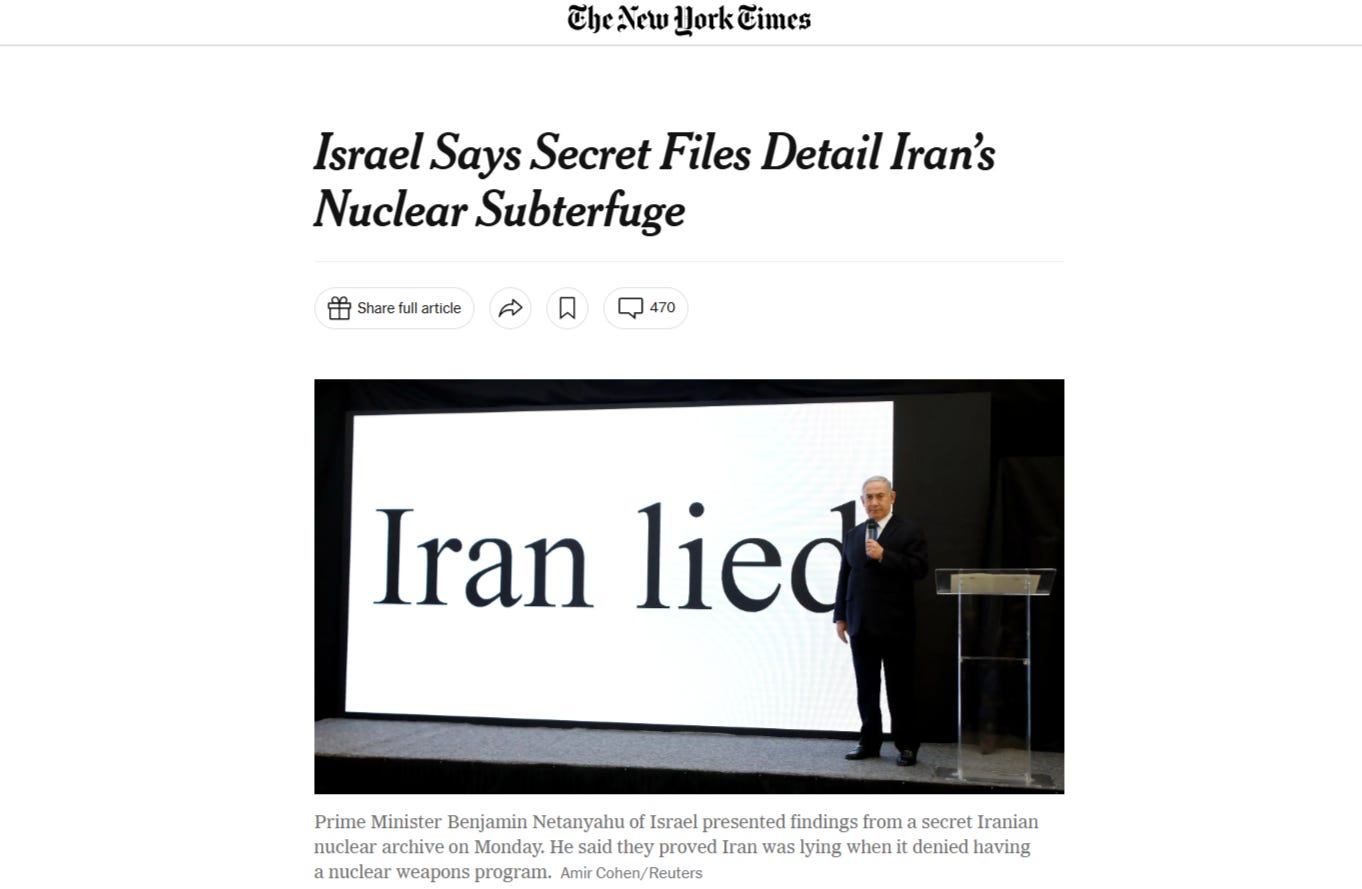 The PT Barnum optics overseen by Bibi at the infamous press conference worked, and the world’s media quickly fell into lock step amplifying the claim that Iran had indeed been lying this whole time.
