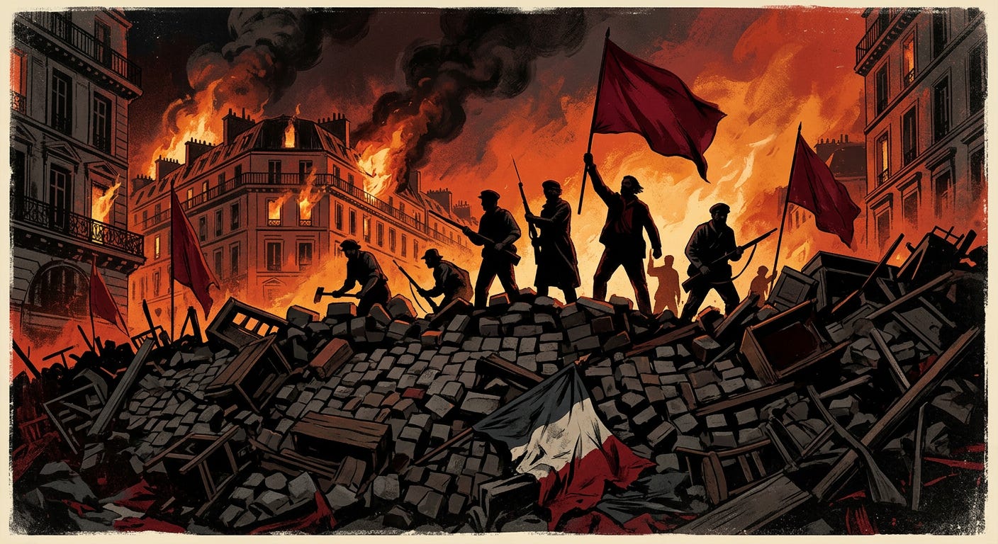 Marx, in The Civil War in France, noted the presence of Jacobin bourgeois radicals among the Communards, but emphasized that the Commune marked the *terminus* of that radical tradition. Its defeat cleared the way for the Third Republic—a stable form of bourgeois rule precisely because it abandoned the revolutionary fervor of its predecessors. From 1789 to 1871: eighty-two years of revolutionary upheaval, restoration, and renewed revolutionary advance before the French bourgeoisie secured a state form adequate to its class dictatorship.
