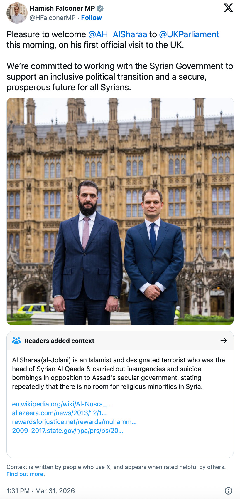 Al-Sharaa was also personally welcomed by Hamish Falconer, an intelligence-aligned Member of Parliament who spent years collaborating with MI6 as the British foreign office’s Terrorism Response Team leader and once served as a hostage negotiator in talks with the Taliban.