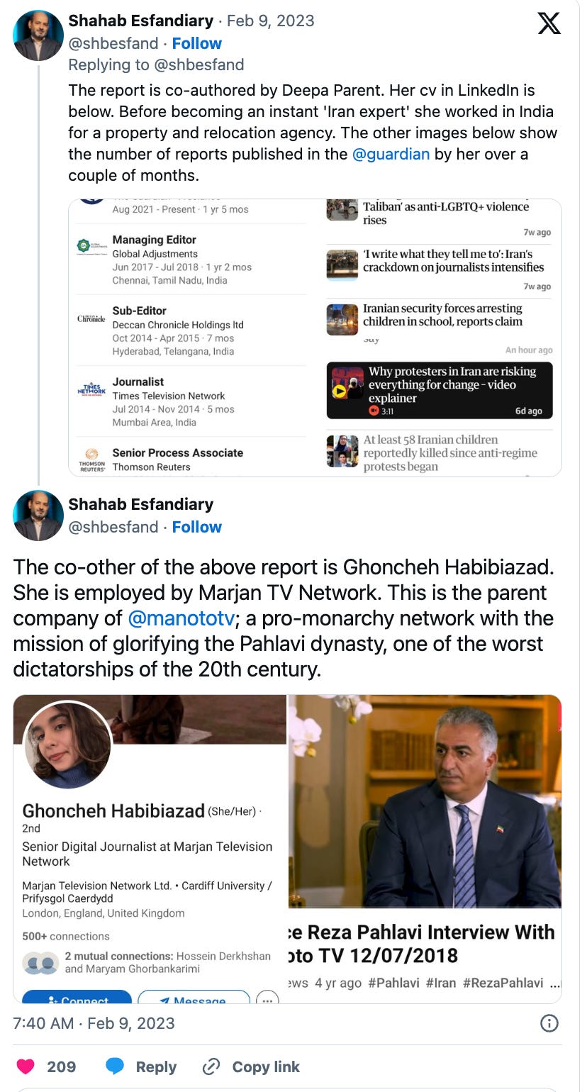 Habibiazad frequently collaborates with Deepa Parent, the disgraced former fashion blogger turned Iranian protest-whisperer who deleted her Twitter account this February after The Grayzone exposed her role in fabricating protest death tolls. Like Parent, Habibiazad rocketed to mainstream media prominence during the “Woman, Life, Freedom” protests which shook Iran in 2022.
