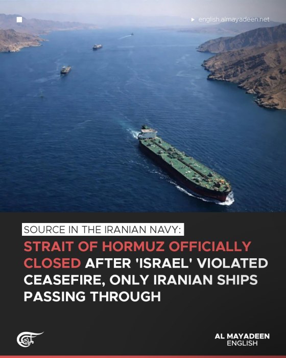 A source in the Iranian Navy announced that the Strait of Hormuz has effectively been sealed off, with only Iranian vessels and ships coming from Iran allowed to pass, underscoring Tehran’s staying true to its words in case of any ceasefire violation.