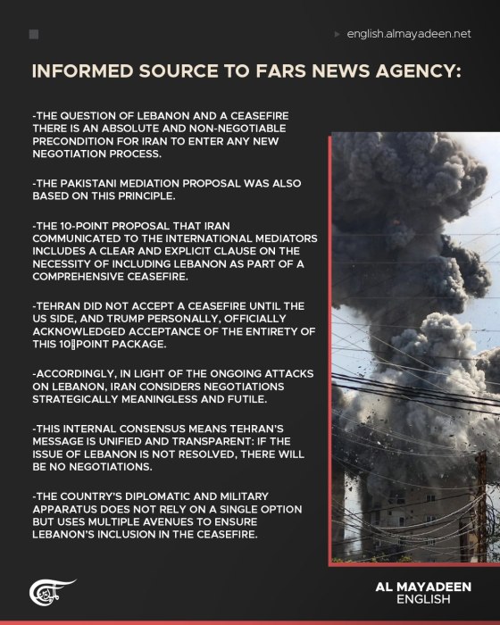 Fars News Agency reported, citing informed sources, that the question of Lebanon and a ceasefire in the country is “an absolute and non-negotiable precondition for Iran to enter any new negotiation process.”