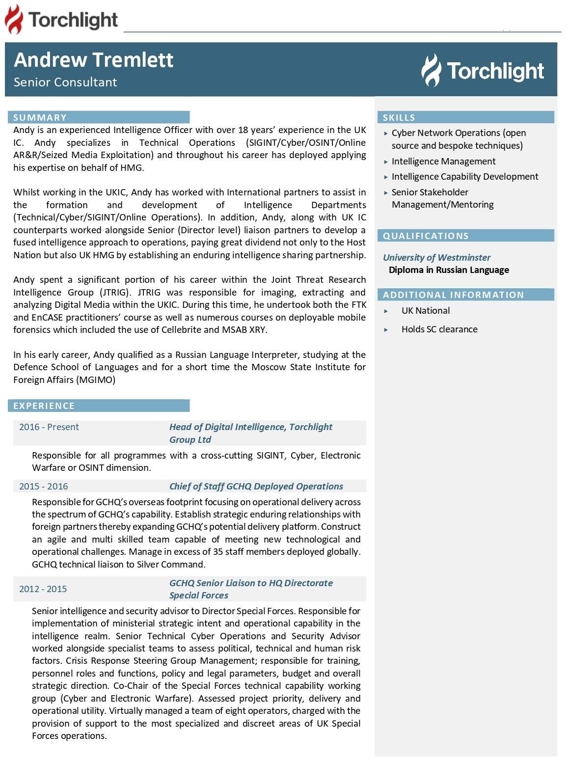 Central to these efforts was GCHQ journeyman Andrew Tremlett. While serving as Torchlight’s head of digital intelligence, he was “responsible for all programmes with a cross-cutting SIGINT [signals intelligence], cyber, electronic warfare or OSINT [open source intelligence] dimension.” A leaked CV notes he spent over 18 years toiling for British intelligence, “primarily” GCHQ. One of his key duties was “[working] with international partners to assist in the formation and development of intelligence departments.” In other words, constructing analogues of MI5, MI6 and GCHQ abroad.